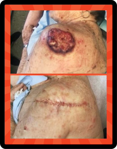 Didn’t Want to Rock the Boat: Elderly patients often do well with treatment but should not delay. By the time Dr. Sarnoff saw the lesion, top, she says it was large, oozing and raised “like a mushroom.” She removed the SCC tumor, and her partner, Robert H. Gotkin, MD, expertly closed the wound.