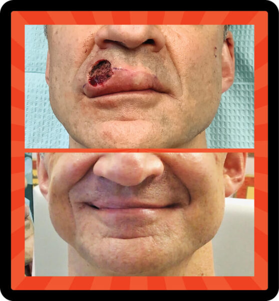 Scary Defect, Good Outcome: One of the hazards of letting an unusual lesion go unchecked is that it can grow beneath the surface. Dr. Sarnoff performed Mohs surgery to remove a BCC on the right side of this man’s upper lip. Luckily, Dr. Gotkin reconstructed the “cosmetically sensitive area,” with excellent results, above.