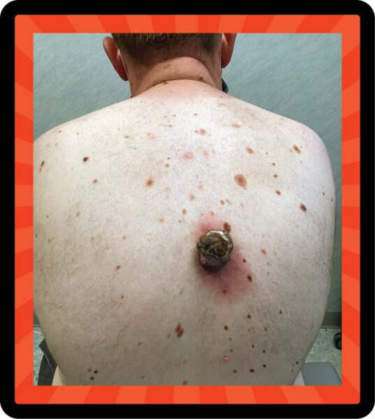 Dr. Sarnoff recently handled one such highly dramatic and tragic case when a patient came into her office with an enormous bandage covering the middle of his back. The “boil” beneath the bandage, the man explained, had been oozing and bleeding for months, regularly staining the sheets on the bed he shared with his wife, who was irritated at the mess. He assumed the boil or cyst was simply slow to heal, and rather than going to a dermatologist to have it checked out (a mistake partially attributable to the COVID lockdown then in place), the man got creative and devised a way to bandage the lesion in such an efficient way that it was completely covered, and no blood or pus oozed out while he slept. Immediate problem solved.
