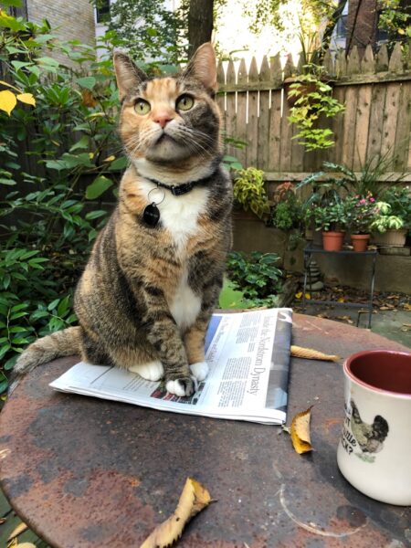 We bonded immediately. My vet estimated her age at 3 to 4 years and confirmed she was healthy. Lucky she was, having landed with a lifelong cat lover who even has a small, fenced backyard — in Manhattan! I didn’t let her outside till spring and kept my eye on her, but once given the privilege, she never once jumped the fence. “She’s a smart one,” I’d say. “She knows when she’s well off.”