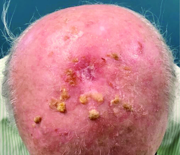 Vulnerable on Top: This 71-year-old man, one of Dr. Hanke’s patients, has multiple actinic keratoses (AKs) on his scalp. “Thick AKs can often progress to invasive squamous cell carcinoma,” Dr. Hanke says. “We recommend prompt treatment to prevent it from progressing.”