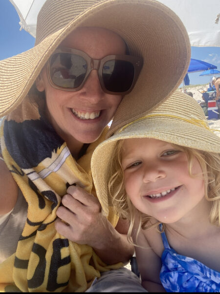 Krista, su esposo y tres niñas (en la foto con la menor) viven en Long Island, rodeados de hermosas playas. Ella les dice a sus hijos: "Podemos disfrutar de la playa siempre y cuando seamos inteligentes con el sol". Eso significa sombrillas, sombreros, bloqueador solar y salir solo fuera de las horas pico. —Krista Bennett DeMaio, editora sénior