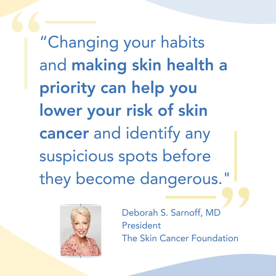 - Revisa tu piel mensualmente: Abre tu calendario y programa 10 minutos cada mes para realizar un skin autoexamenEs sencillo y podría salvarte la vida. Si ves algo nuevo, cambiante o inusual¡Asegúrese de que lo examinen de inmediato! Cuando se identifican y se tratan a tiempo, los cánceres de piel suelen ser muy curables.