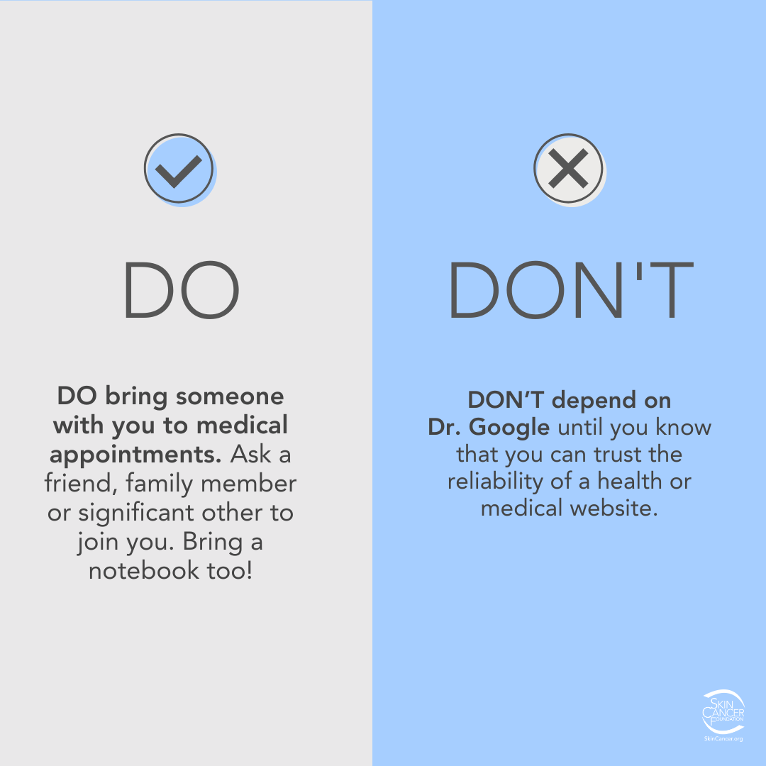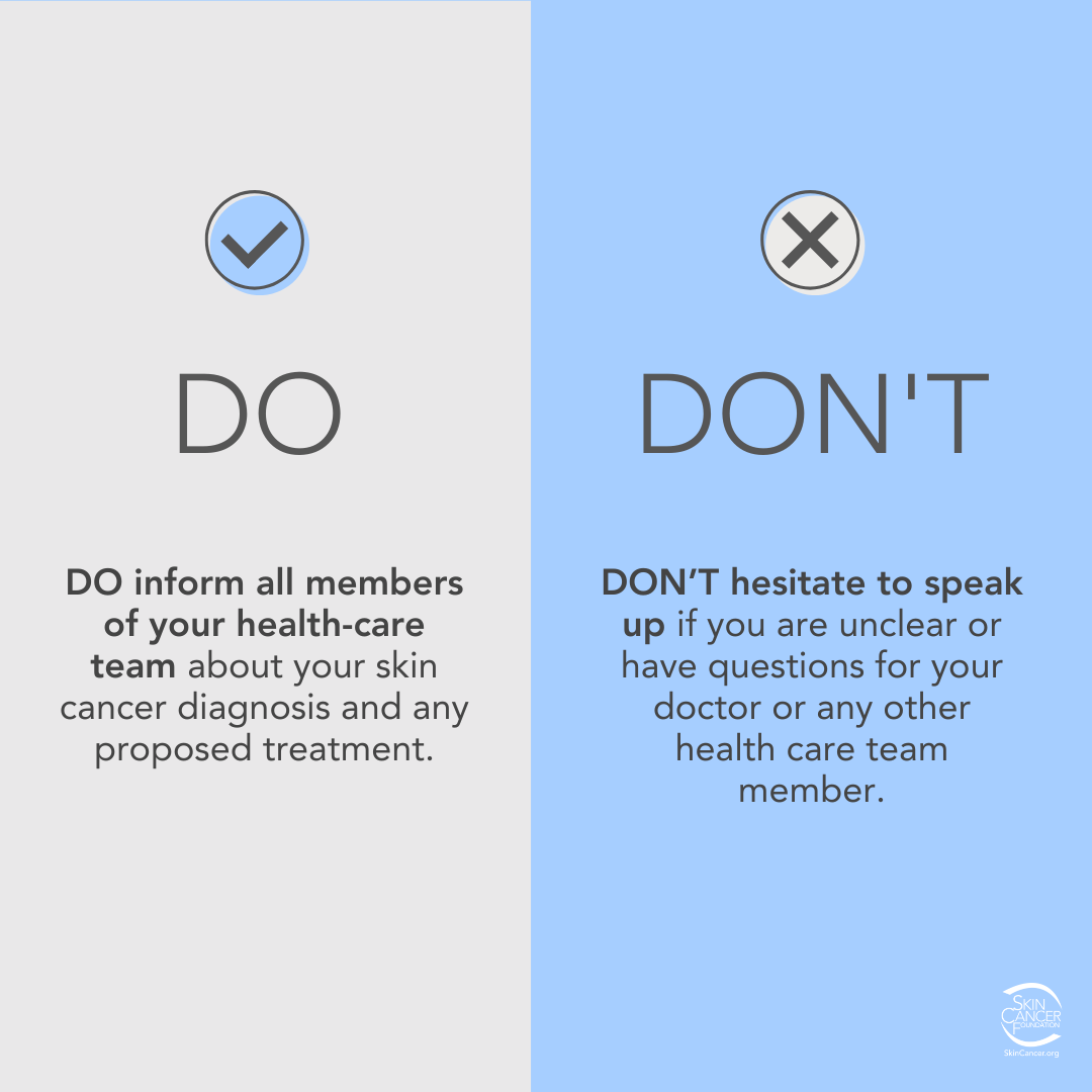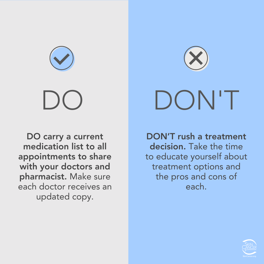 - Ask questions. When speaking to your doctors, take notes and make sure that you fully understand your treatment options. Ask about surgery, whether you will need a plastic surgeon, treatment side effects and what to expect during recovery. Check our Do’s and Don’ts for Skin Cancer Patients for more helpful tips.