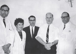 El primer equipo de Mohs en NYU. De derecha a izquierda: Dr. Perry Robins, Dr. Frederic E. Mohs, Dr. Alfred W. Kopf, Leona Mandell, Dr. Hugh Brown.
