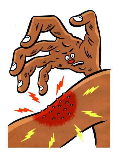 Si me preguntas cómo me siento en un momento dado, lo más probable es que la respuesta te pique. Y si no encuentras alguna excusa para alejarte de mí, es muy probable que escuches en qué parte de mi cuerpo me pica, con qué intensidad y (si estamos atrapados en un ascensor y muy aburridos), puedo mostrarte tú, la roncha, la urticaria, el sarpullido o la picadura de insecto que en ese mismo momento estoy intentando no rascarme. Yo era el niño del campamento de verano con manchas de calamina rosa chicle en brazos y piernas; el recién casado cuya luna de miel en Sicilia incluyó un juego romántico de “¿Qué comió Stephanie para que le picaran los labios?”; y que, cuando tenía casi 40 años, finalmente aprendí que la cera de abejas, un ingrediente común en los lápices labiales, el rímel y otros cosméticos, me produce dermatitis y me enrojece los ojos, me humedece y me pica tanto que tengo que sentarme sobre las manos.