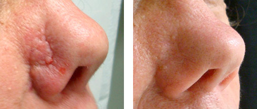 Narbenreparatur. Links: Dr. Khorasani verwendete einen Hautlappen von der Wange, um eine Wunde von Mohs Operation an der Nase zu bedecken. Rechts: Die Narbe nach Dermabrasion und Laserbehandlung.