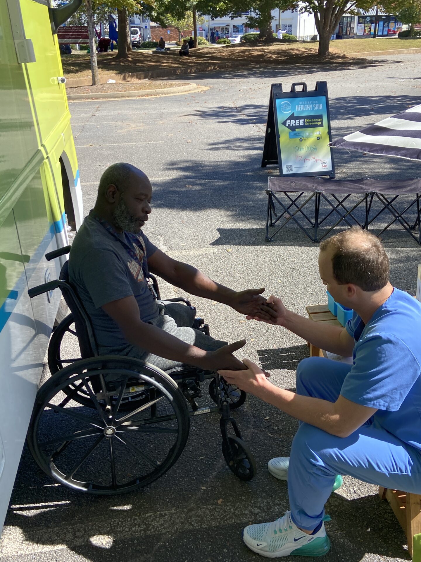 Der Herbst war in vollem Gange und wir fuhren mit dem Wohnmobil nach North Carolina und verbrachten drei Tage in der Innenstadt von Raleigh mit langjährigen und neuen freiwilligen Dermatologen. Viele Teilnehmerinnen waren froh, dass sie sich keine Sorgen mehr um ihre beunruhigenden Flecken auf der Haut machen mussten, aber manche verließen die Untersuchung mit Plänen für eine Nachuntersuchung – eine Frau, die sich einer Untersuchung bei Carol Trakimas, DOC, unterzogen hatte, verließ die Untersuchung mit einem Termin für eine Biopsie wegen eines vermuteten Basalzellkarzinoms.