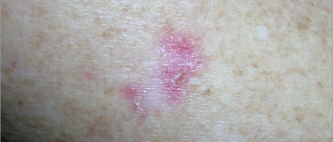 - A reddish patch or irritated area, on the face, chest, shoulder, arm or leg that may crust, itch, hurt or cause no discomfort.